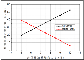 (3)第三模块获取所有偏磨危险点对应的第二曲线,第二曲线指示在某偏磨危险点处杆管作用力绝对值与井口抽油杆轴向力的对应关系。