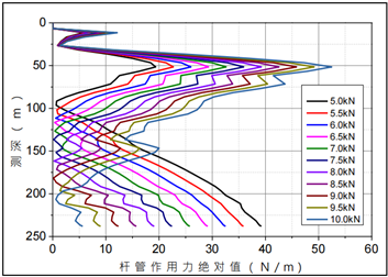 (1)第一模块获取若干个井口抽油杆轴向力对应的第一曲线,第一曲线指示在某井口抽油杆轴向力下杆管作用力绝对值与测深的对应关系,杆管作用力指示抽油杆与油管的摩擦程度。