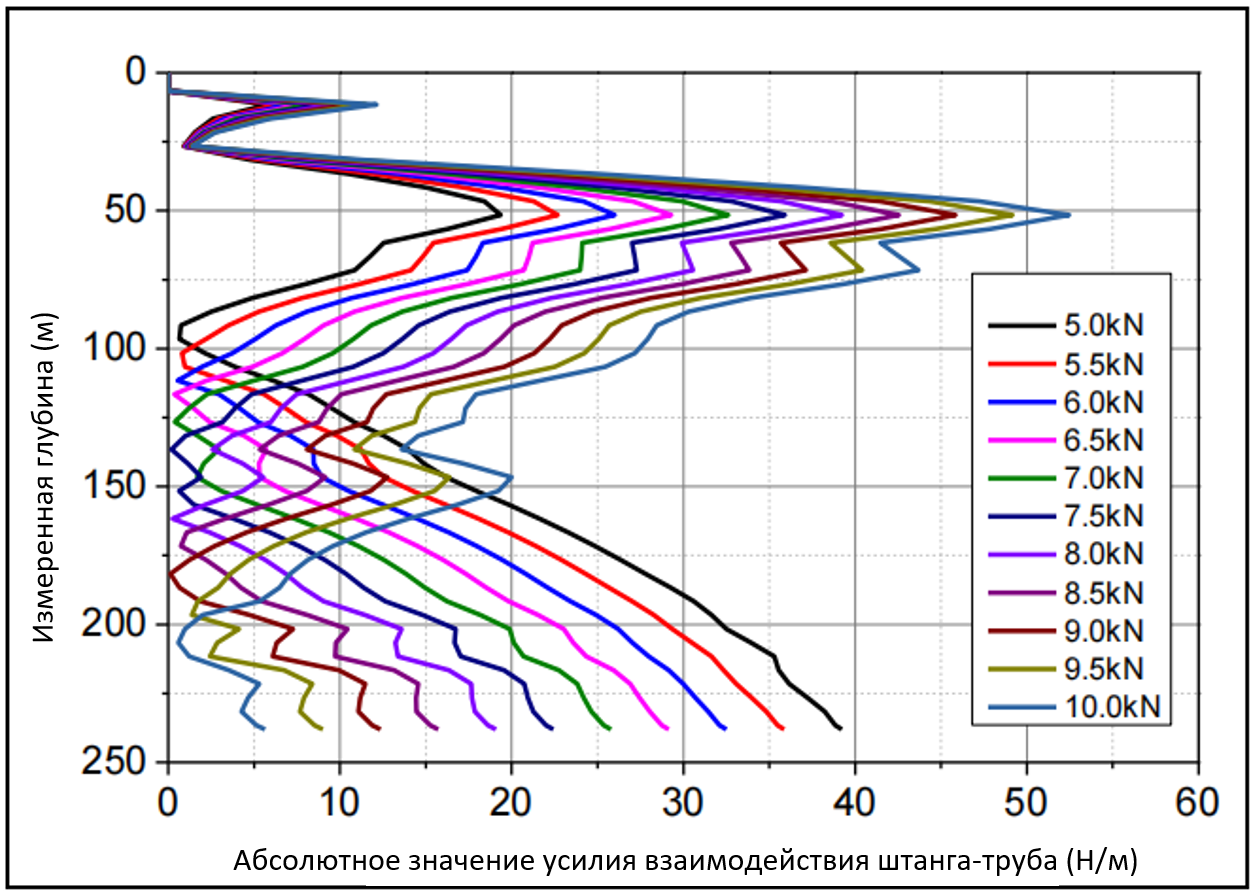 (1) Модуль 1: Генерирует первичные кривые, показывающие зависимость силы взаимодействия штанга-НКТ (отражающей степень трения) от измеренной глубины (MD) для различных значений устьевого осевого усилия.